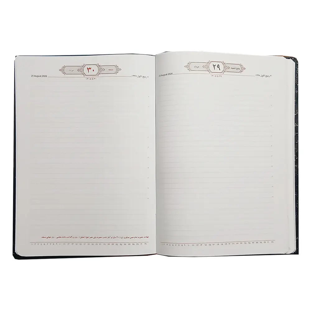 یکی از ویژگیهای برجسته این سررسید، جداسازی روزهای پنجشنبه و جمعه است که به دلیل تعطیلی این دو روز، فضای مناسبی برای برنامهریزی ویژه یا یادداشتهای خاص فراهم میآورد.