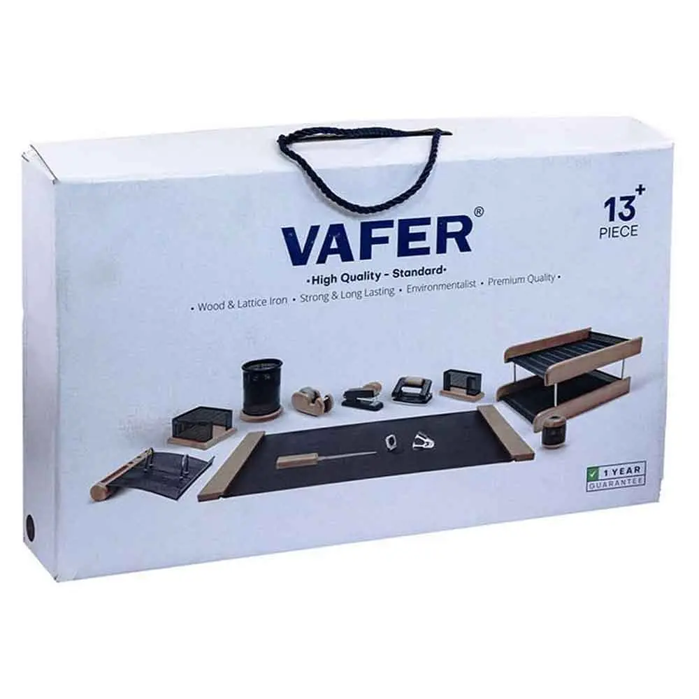ست رومیزی چوب و فلز 13 تکه وافر اگر به دنبال سر و سامان دادن به وسایل مورد نیاز بر روی میز کار خود هستید و می خواهید هر کدام از وسایل را در جایی مشخص و مناسب قرار داده تا در زمان نیاز به راحتی به آن ها دسترسی داشته باشید ما به شما ست رومیزی چوب و فلز 13 تکه وافر را پیشنهاد می کنیم که ظاهری شیک و چشم نواز به دفتر کار شما می بخشد. این ست رومیزی اداری مدیریتی شیک ساخته شده از چوب با کیفیت با تنوع رنگی (قهوه ای روشن و تیره) و فلزی با ضخامت بالا و پوشیده شده با رنگ الکترواستاتیک و تنوع رنگی مشکی است که امکان استفاده از این ست رومیزی چوب فلز را تا مدت های زیادی برای شما همراه با قابلیت ست کردن با انواع وسایل روی میز اداری دیگر فراهم می کند.